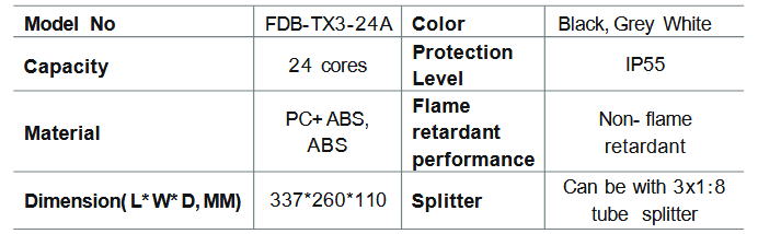 YIPU Model No. FDB- TX3 – 2 4 A can connect the drop cable with feeder cable as the termination point in the Fttx network, which is cable to meet at least 2 4 users requirements. It can help splicing, splitting, storage and management with suitable space.